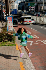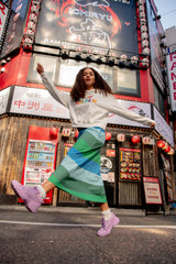 Our campaign is set against the electric streets of Harajuku, soft knits contrast sharp city lines, and saturated brights cut through concrete grey. Designed for trans-seasonal layering, Tokyo Blooms invites you to mix, match and make it your own. Lightweight knits, structured denim and easy cotton silhouettes move with you.