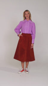 Woman wearing a light purple shirt and rust-colored corduroy skirt on a gray background Dharma Skirt - Rust Dharma Skirt - Rust Dharma Skirt - Rust