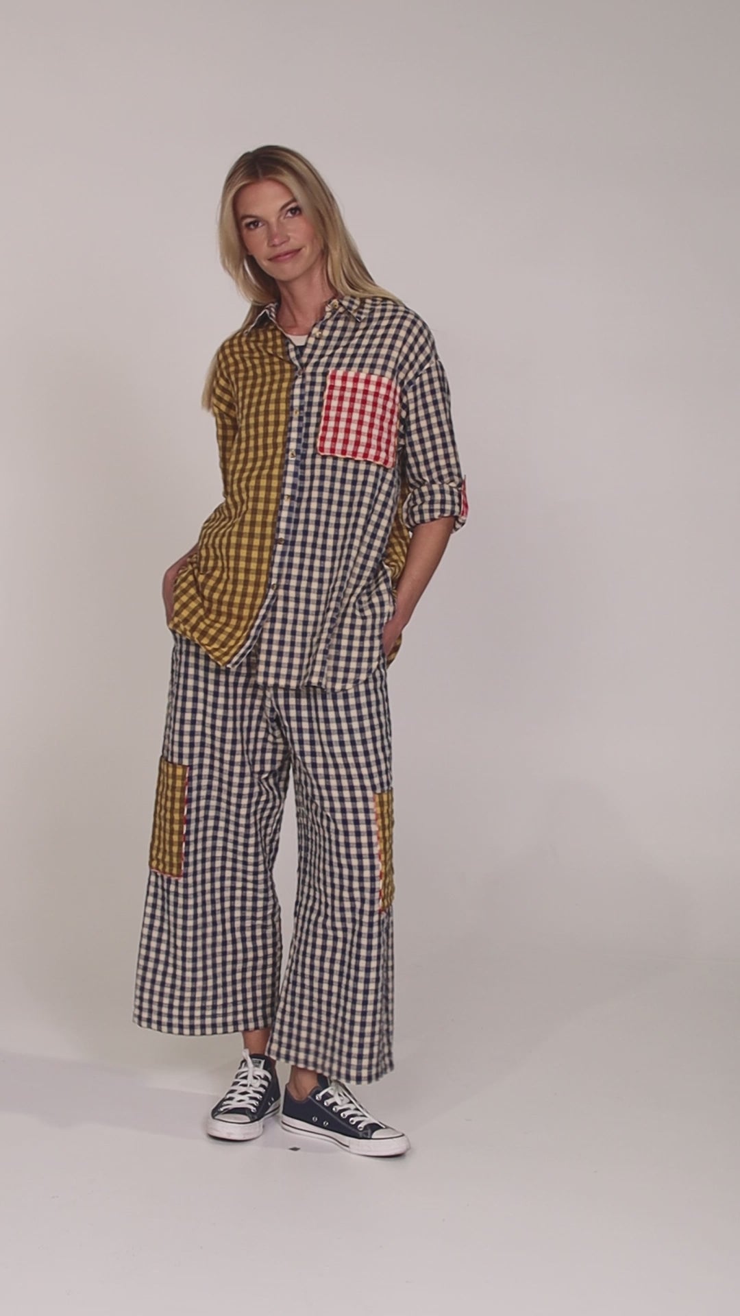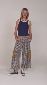 100% cotton seersucker gingham, 7/8 length leg, elasticated waistband, two side pockets, two large patch pockets on the lower leg.