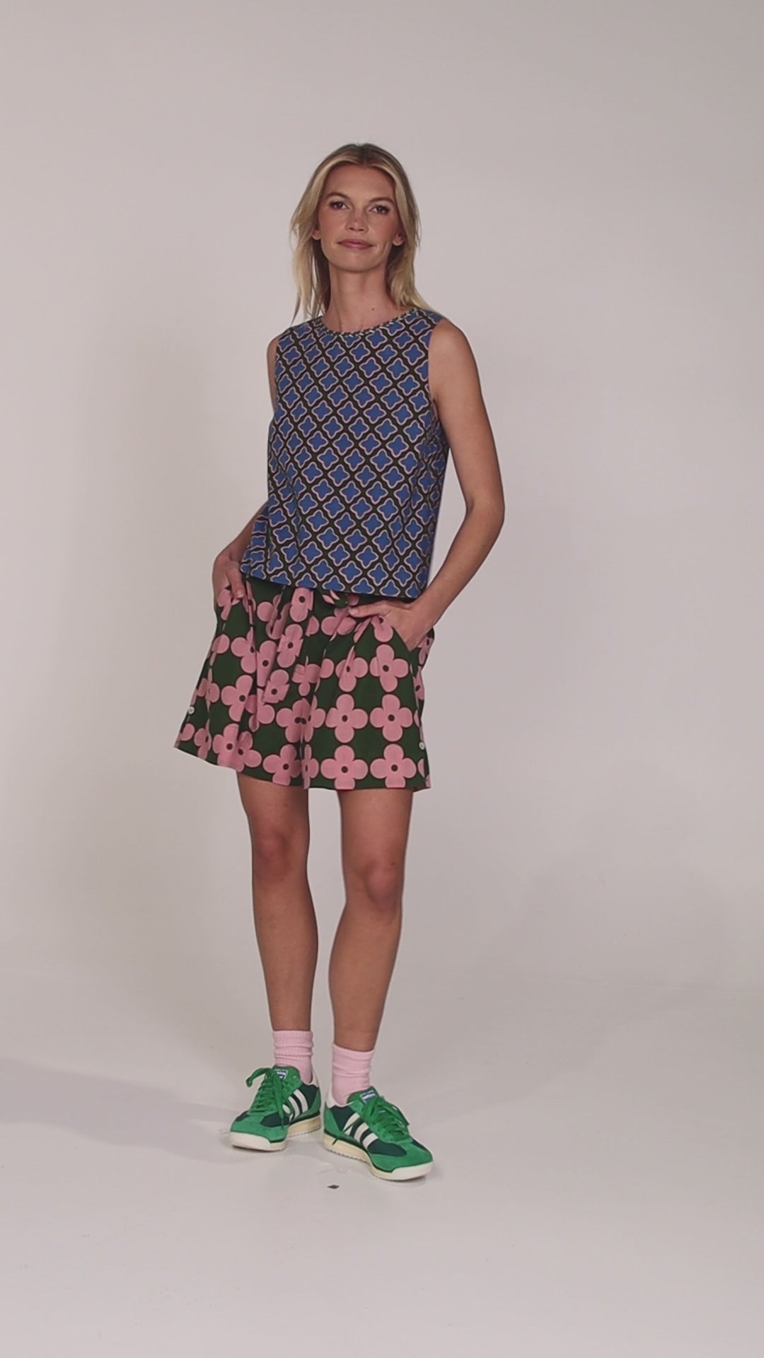 BOLD BLOOM MEETS RETRO GEO. Introducing Keiko, a floral print with a twist! Oversized, graphic petals in soft blush pink pop against a saturated emerald base, creating a print that feels playful, powerful and completely modern. Confident and a little unexpected, Yumi is the perfect retro geo. Crafted from lightweight cotton with a smooth, breathable feel, she’s designed to move with you. Vibrant, effortless and ready to make an entrance. Wear the prints together or pair it back with our denim heroes and Midori Cotton Essentials.