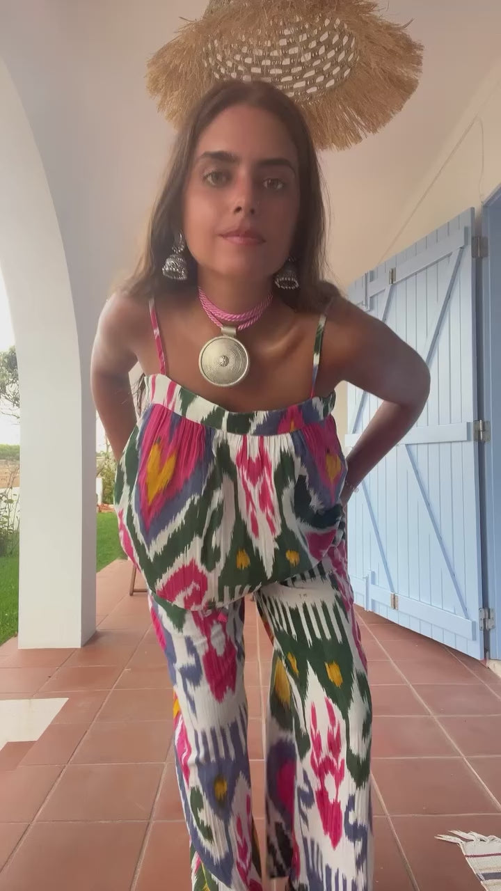 The Boom Shankar Harper Pant is a fun and bold wide-leg pant in our statement Chianti ikat. Pair it with the Sami Singlet in Chianti for a stunning matching set!