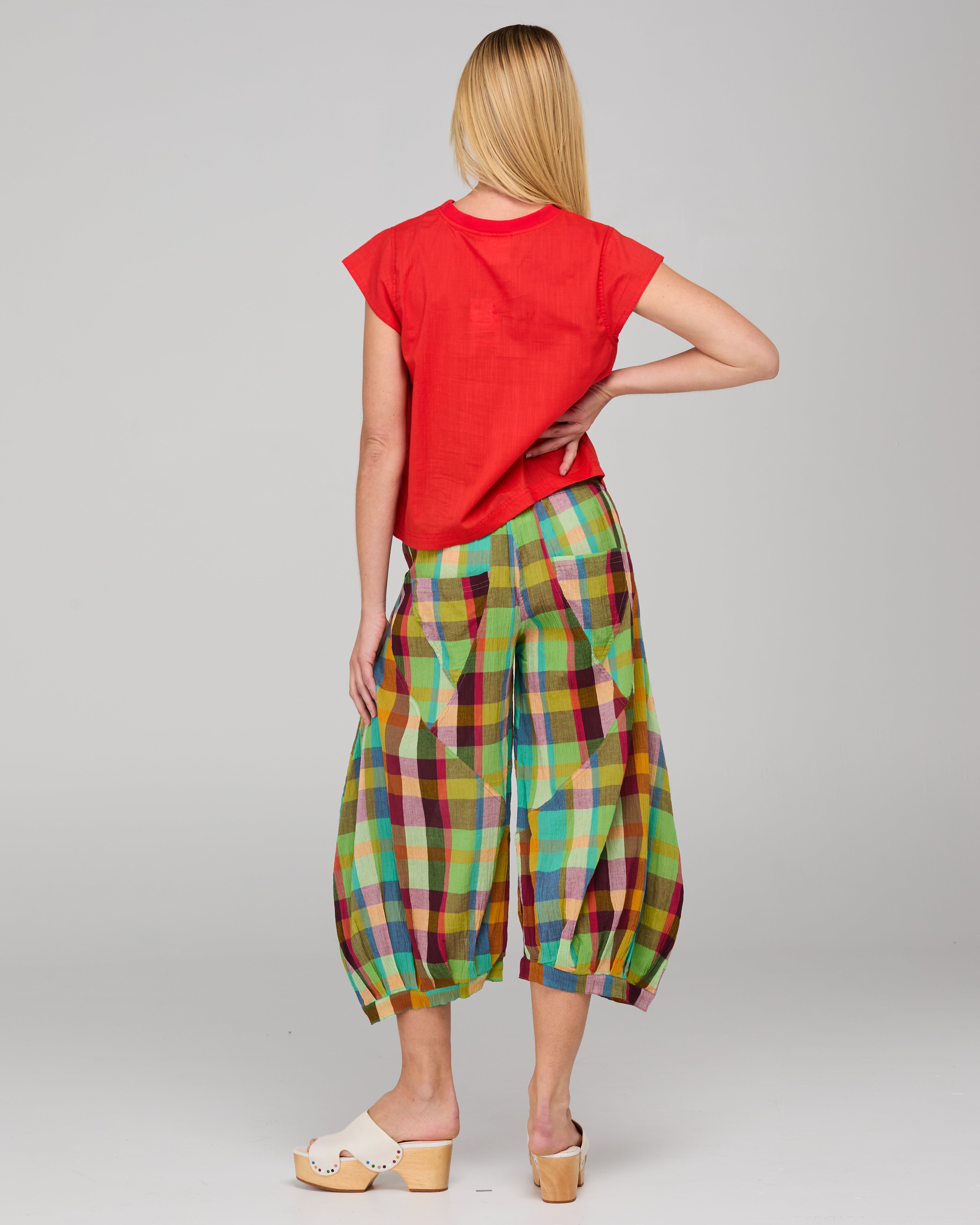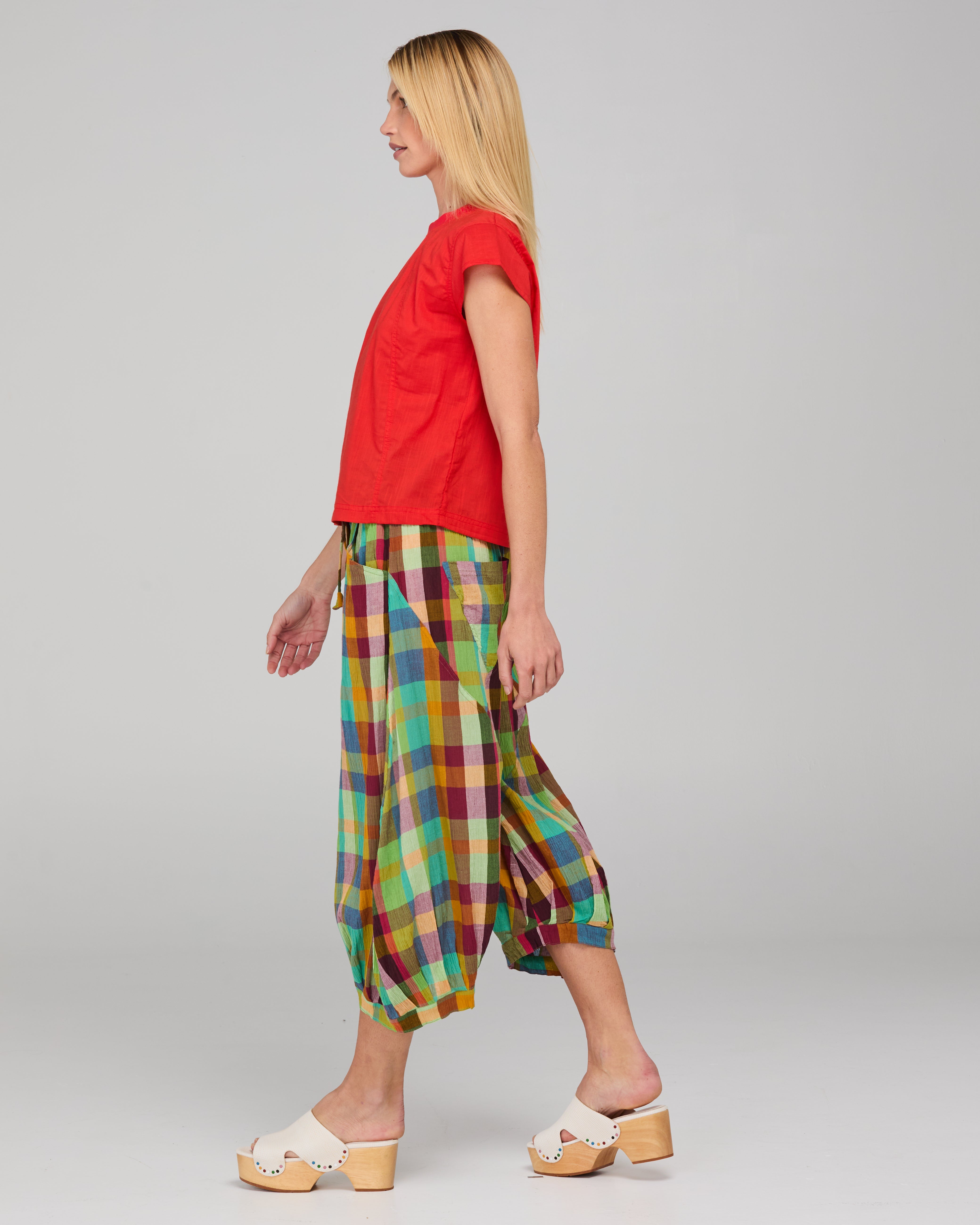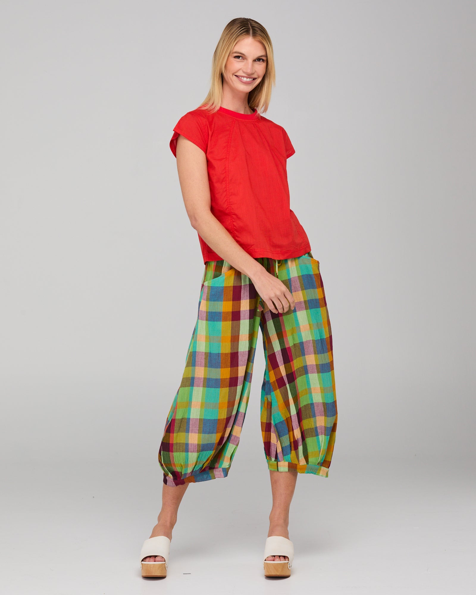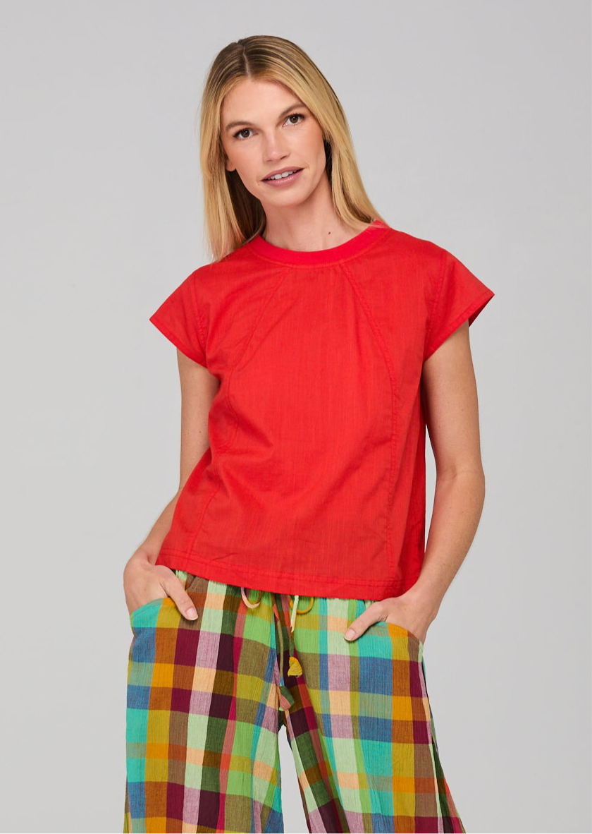 100% cotton, mid length, front seam detail, high ribbed neckline and cap sleeves.