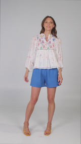 The Boom Shankar Lila Top is classic, cool and carefree in 100% cotton. This floaty tunic style top features contrast print panels, multicoloured stitch detailing, balloon sleeves with elasticated opening and v-neckline with fabric buttons.
