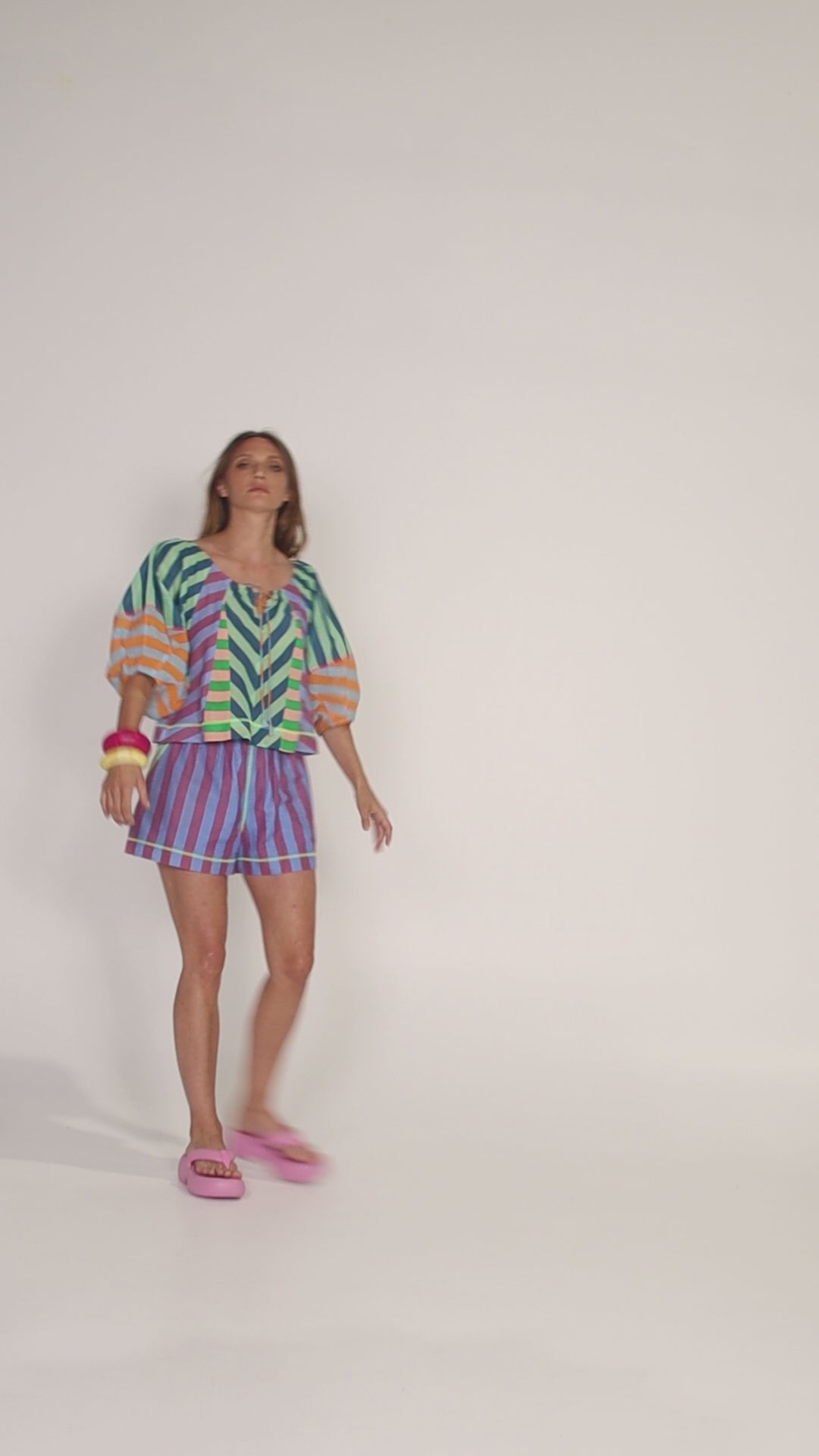 It doesn't get more colourful than the Boom Shankar Lucia Top. Crafted from 100% cotton in signature spliced stripes with contrast neon stitching, it's a must-have for colour-lovers this summer.