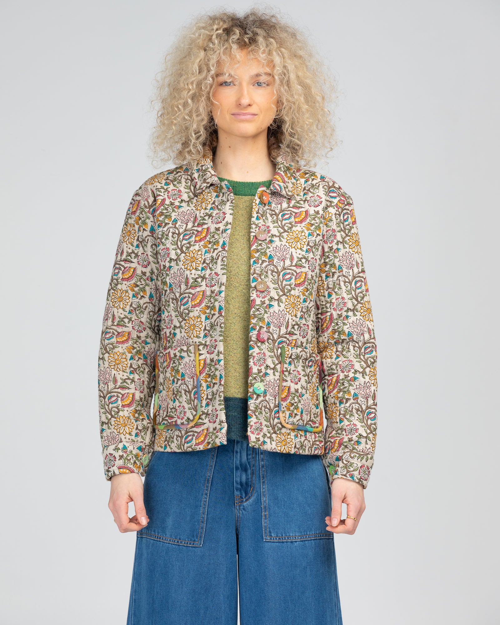 The Boom Shankar Matilda Jacket is a tailored-fitting jacket with feature vertical quilted stitching and contrast rainbow pocket piping and buttons. This is one of our truly unique pieces.