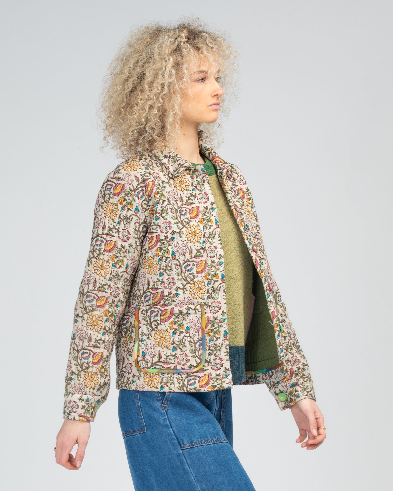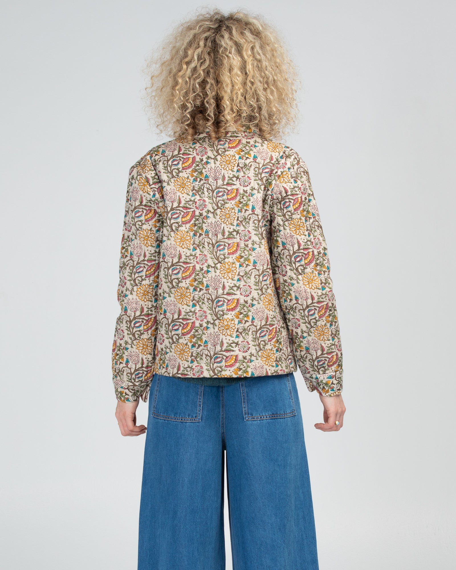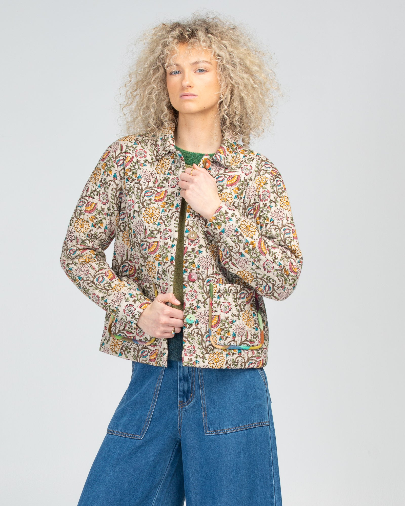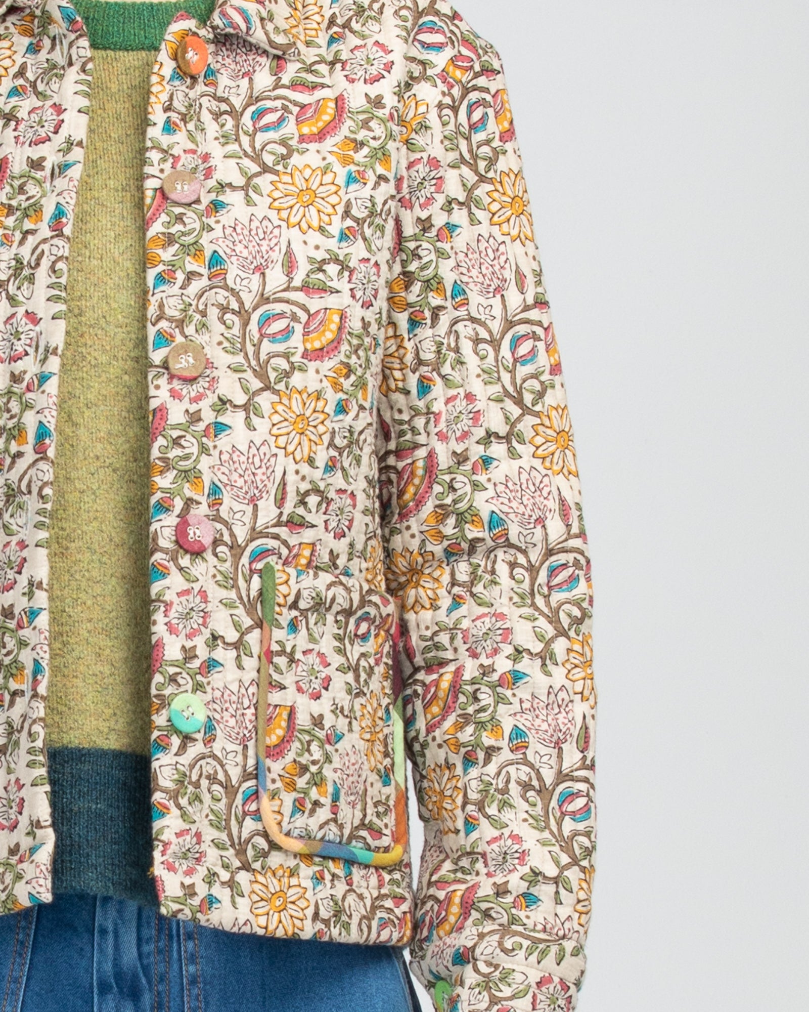 100% cotton, quilted, padded, long sleeve, CF placket with contrast buttons, collar, front pockets, and contrast piping around pockets.