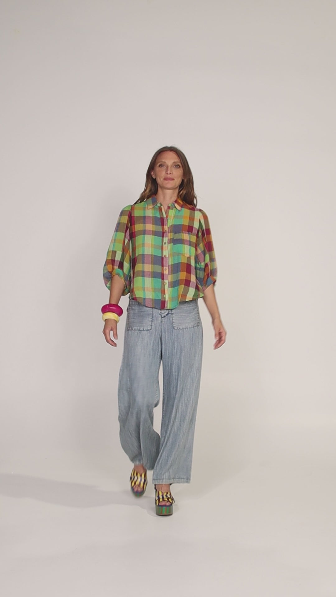100% cotton, blouson sleeve, collar stand with collar, CF placket opening with buttons.