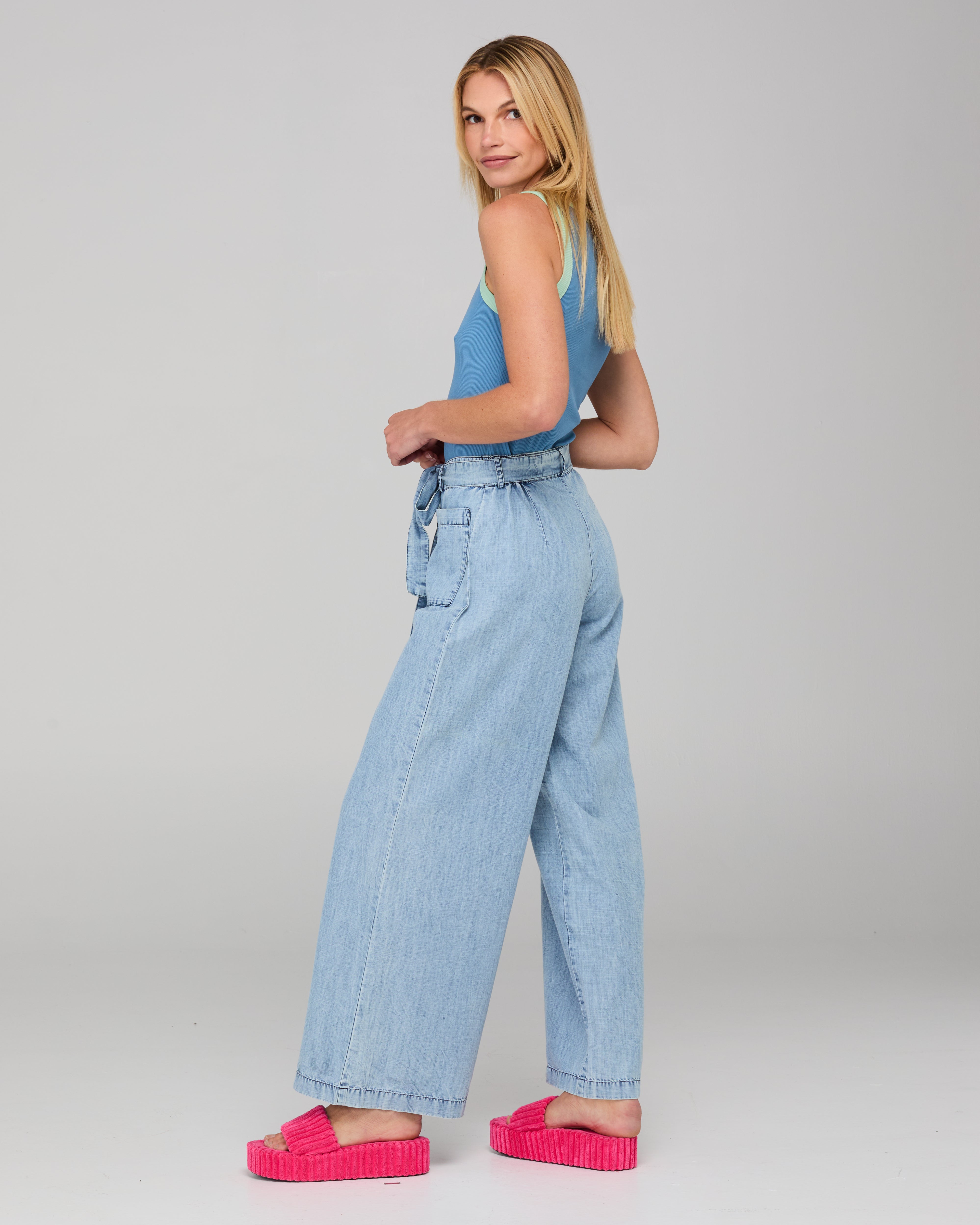 100% lyocell, full length, wide leg, fly front opening with button, front pockets, stone washed soft fabric and belt loops.