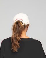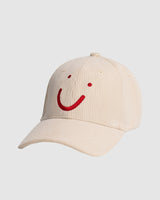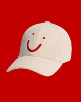 The Boom Shankar Smile Cap is a unisex corduroy cap with our signature Boom Smile embroidered on the front and SMILEFORASMILE text on the back in red stitching against a cream base.